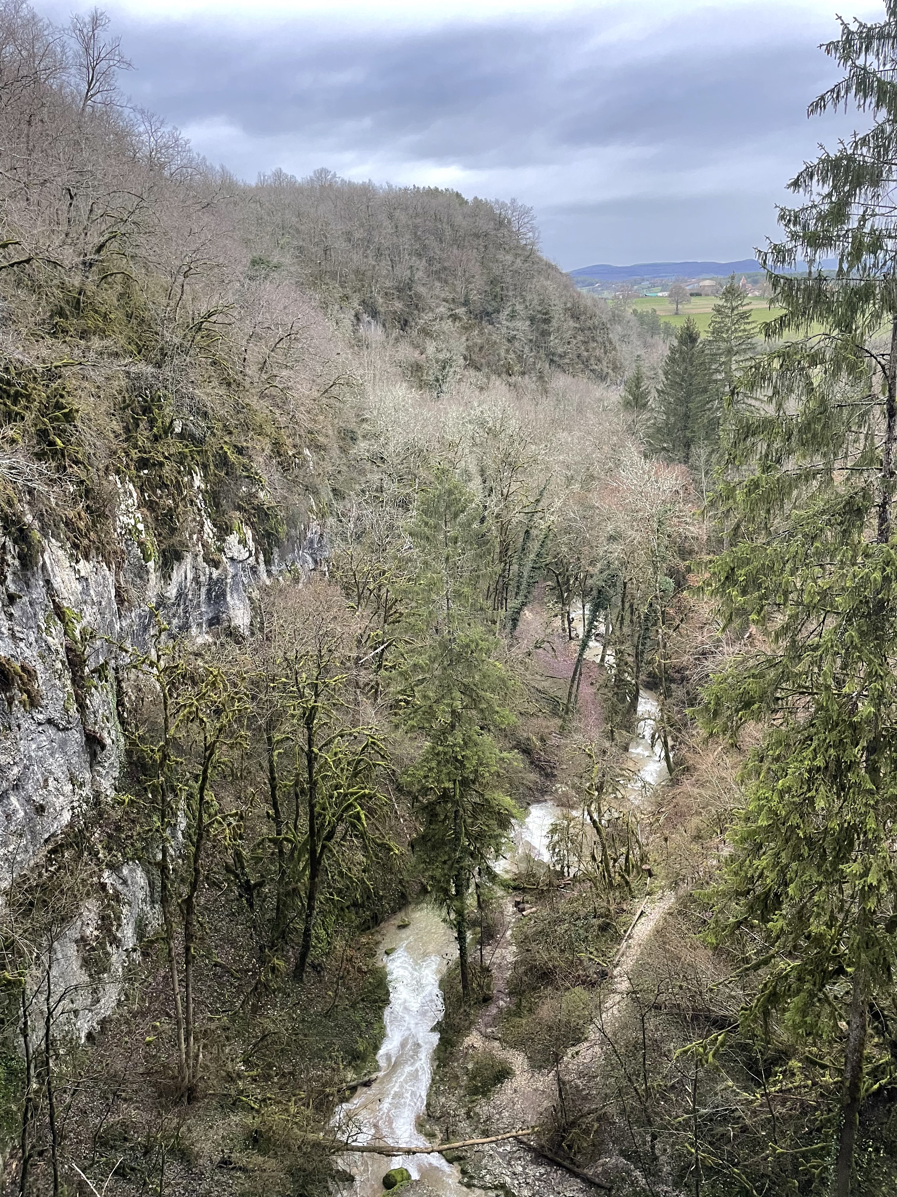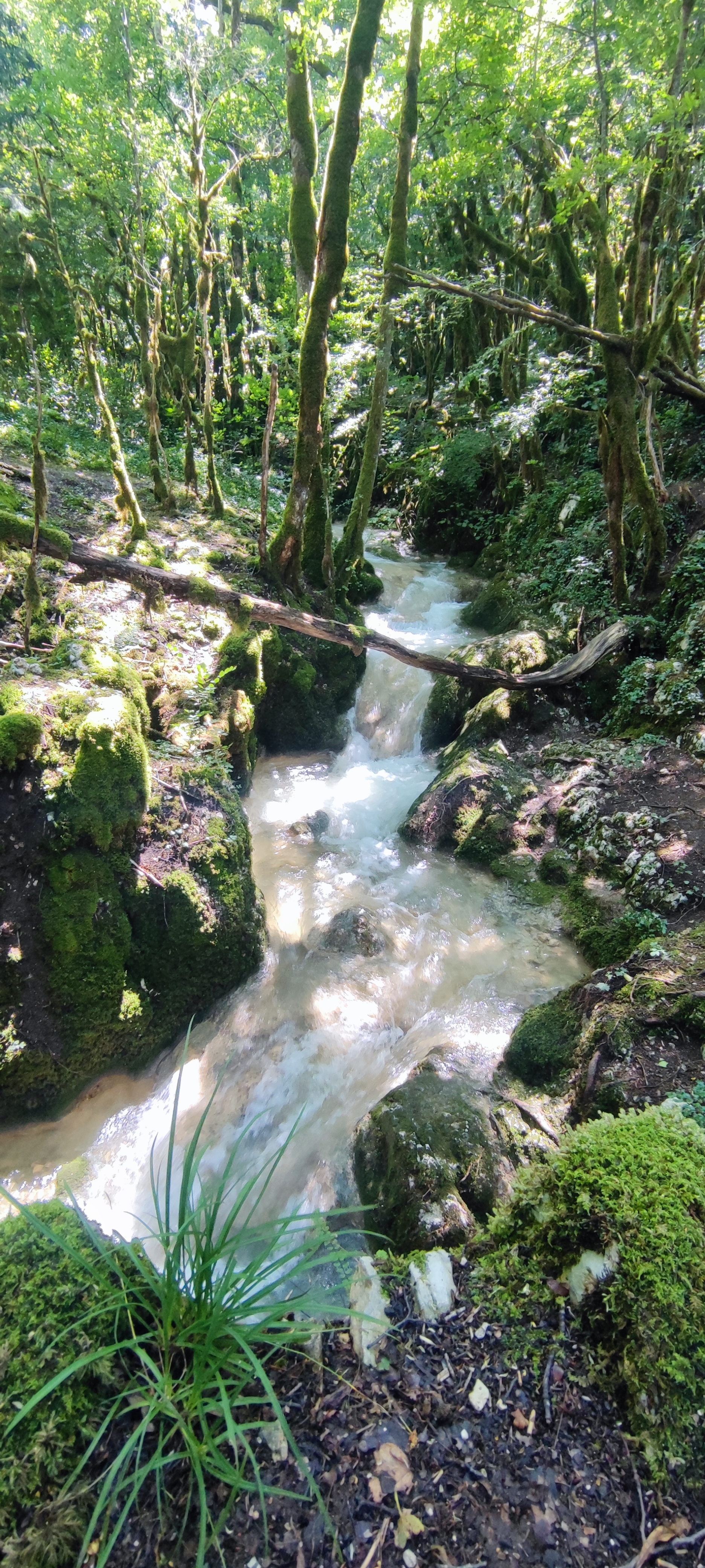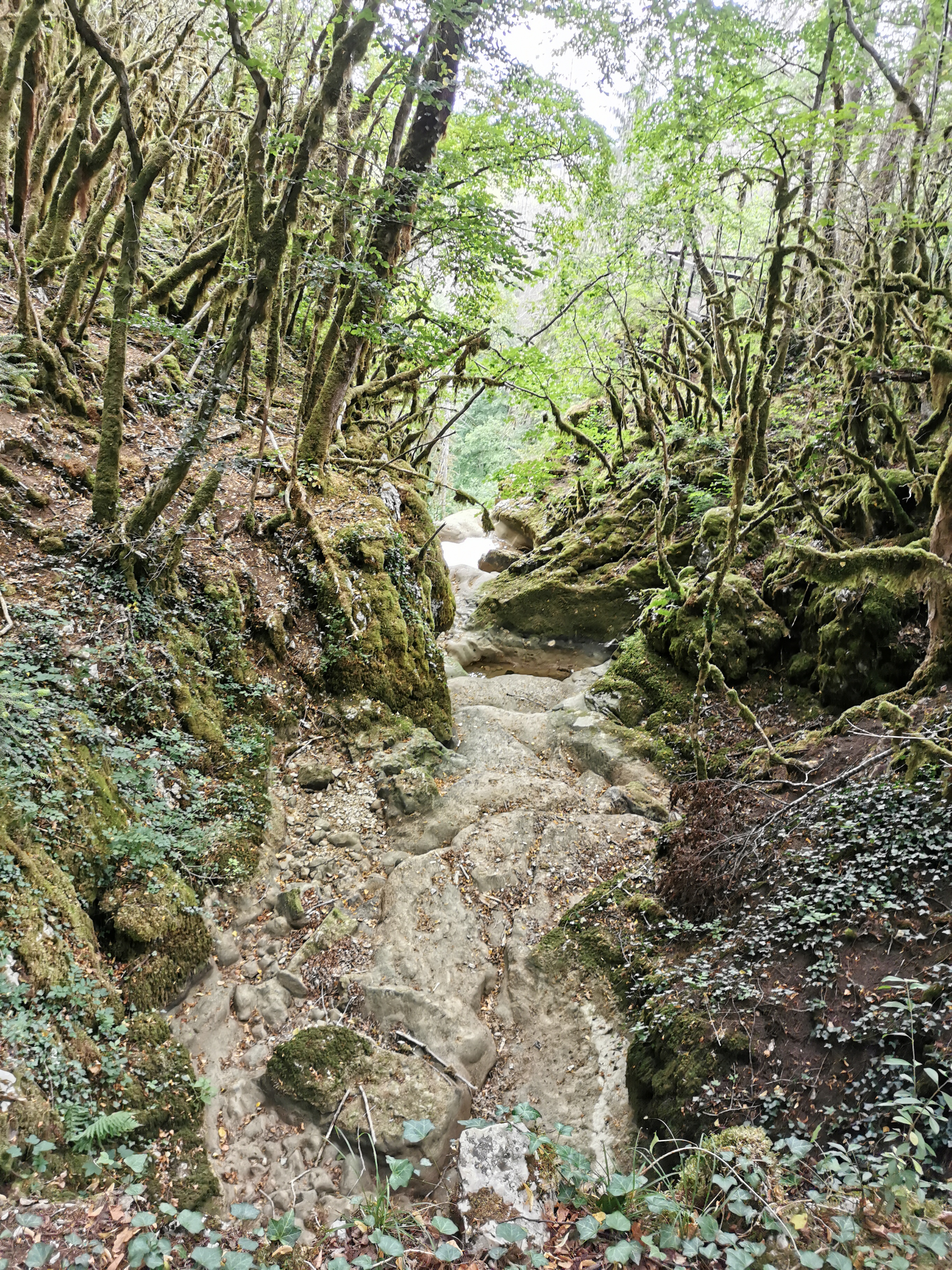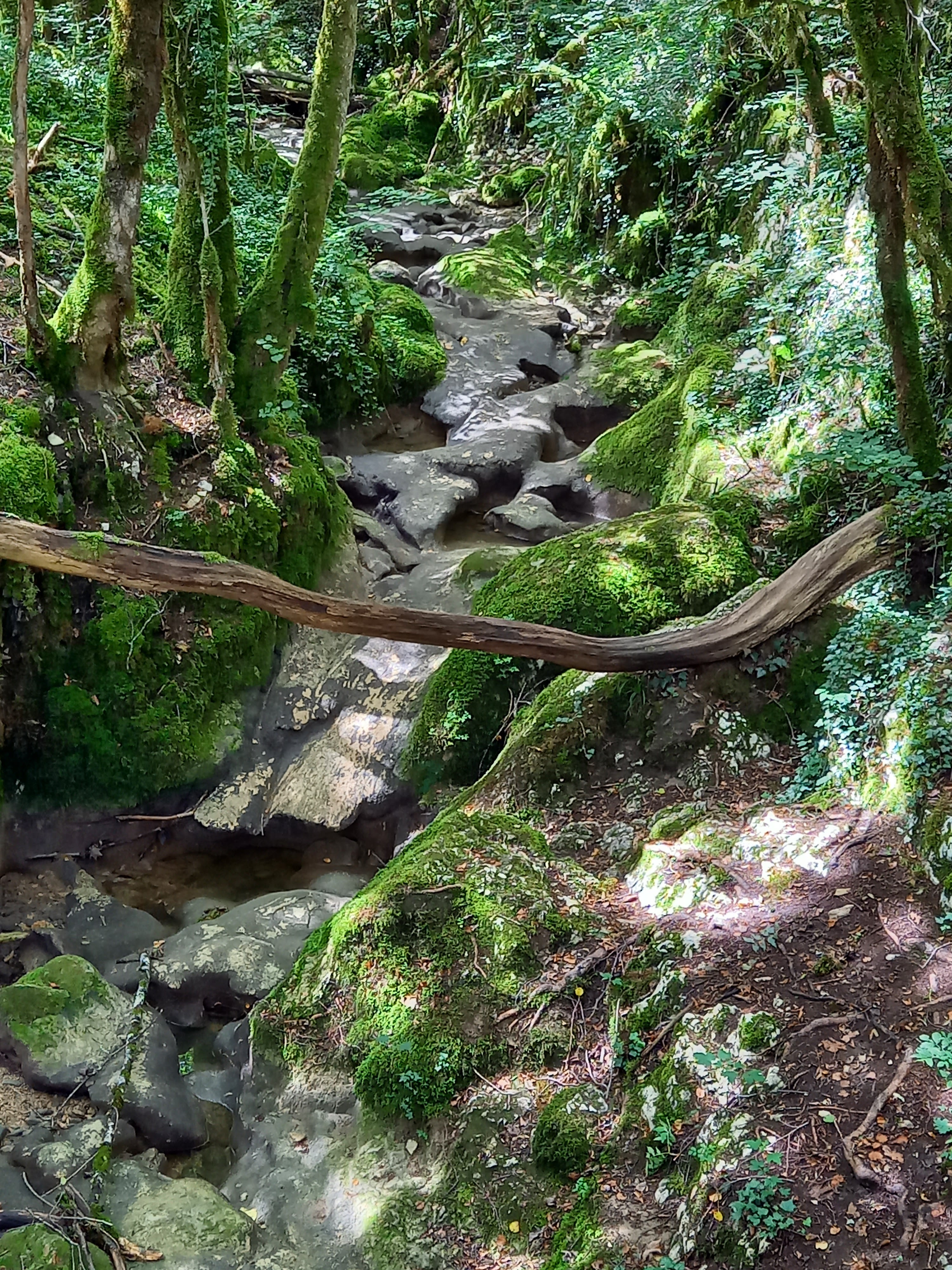Pas d'eau à cette époque de l'année mais l'endroit est vraiment magnifique. Avec tous les arbres couverts de mousse, le vieux pont de pierre au-dessus du cayon, on a l'impression que des elfes vont soudainement sauter devant vous.