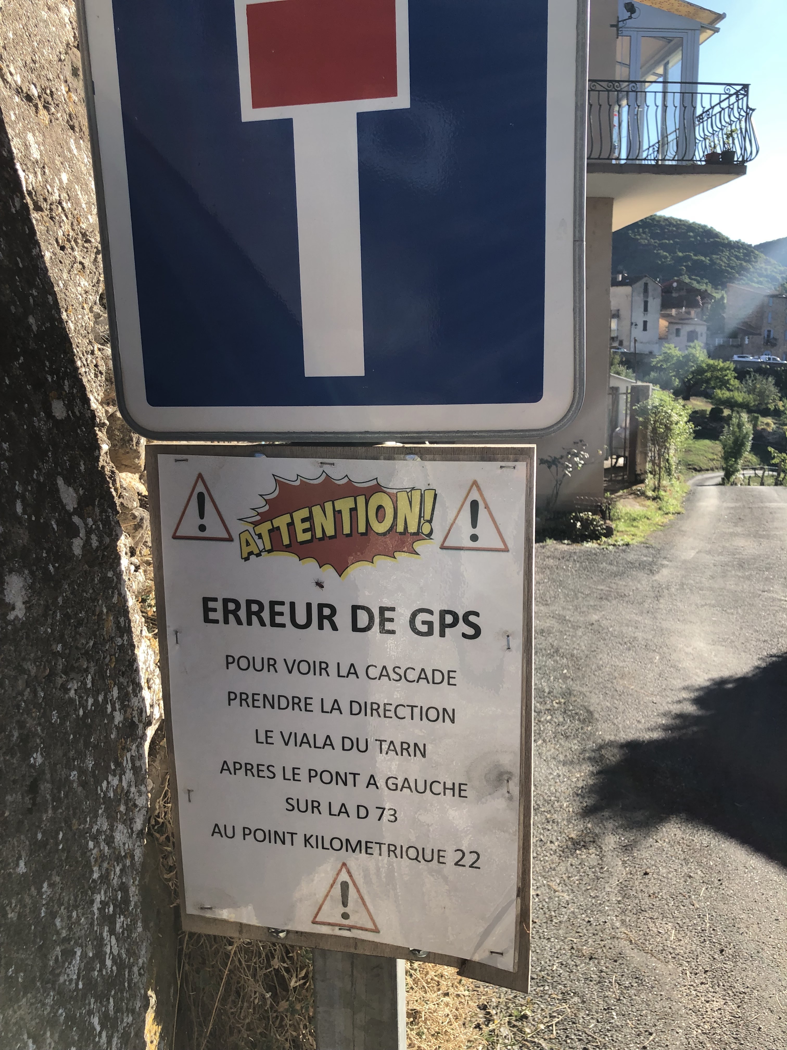 Attention, ne suivez pas l'itinéraire donné par le GPS si vous partez à pied du village St Rome du Tarn, vous tomberez sur une propriété privée et un panneau signalant l'erreur du GPS...